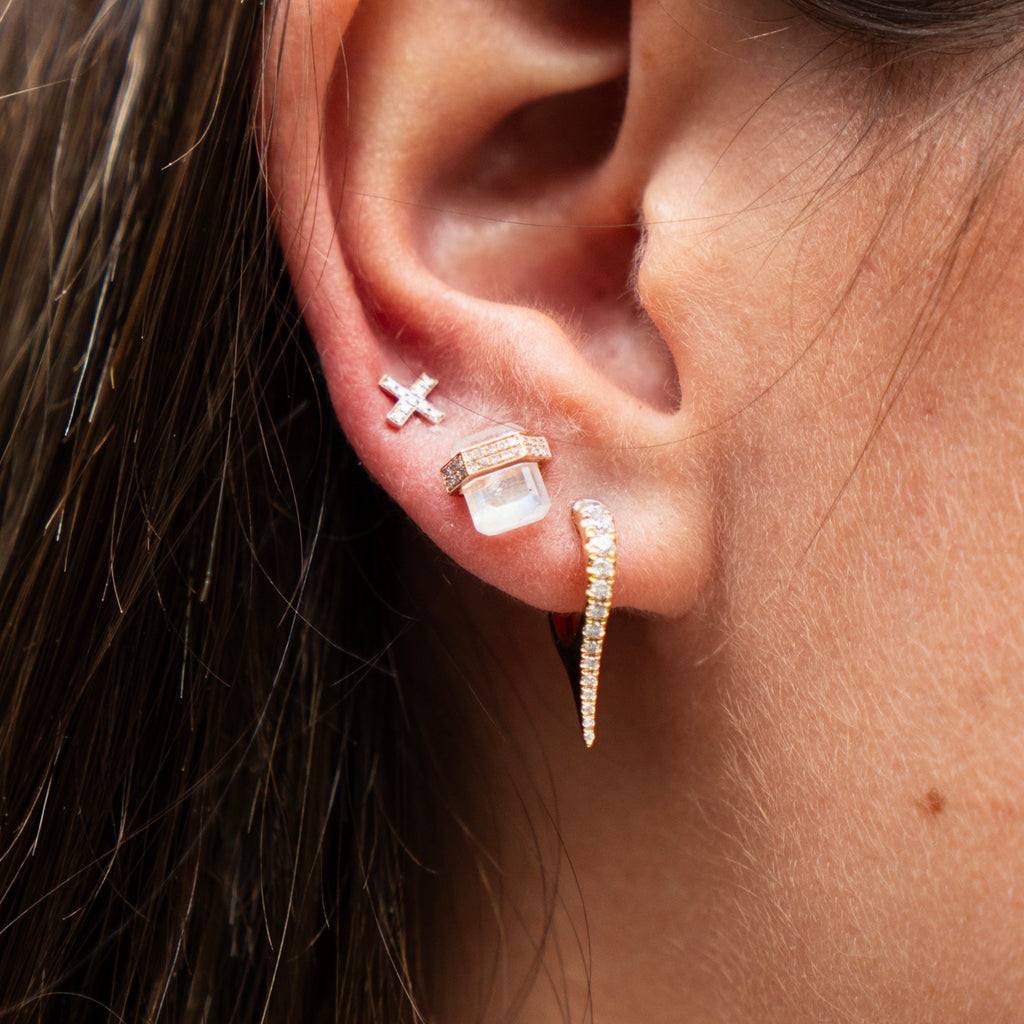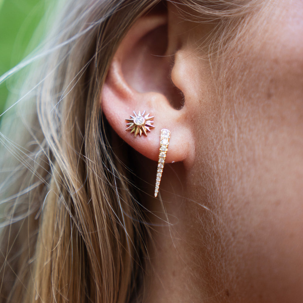 We love the modern and clean silhouette of these petite yet dramatic hoops! 14 karat high polished gold set with graduated Diamonds. 28 Diamonds weighing .41 cts. 14k yellow gold.